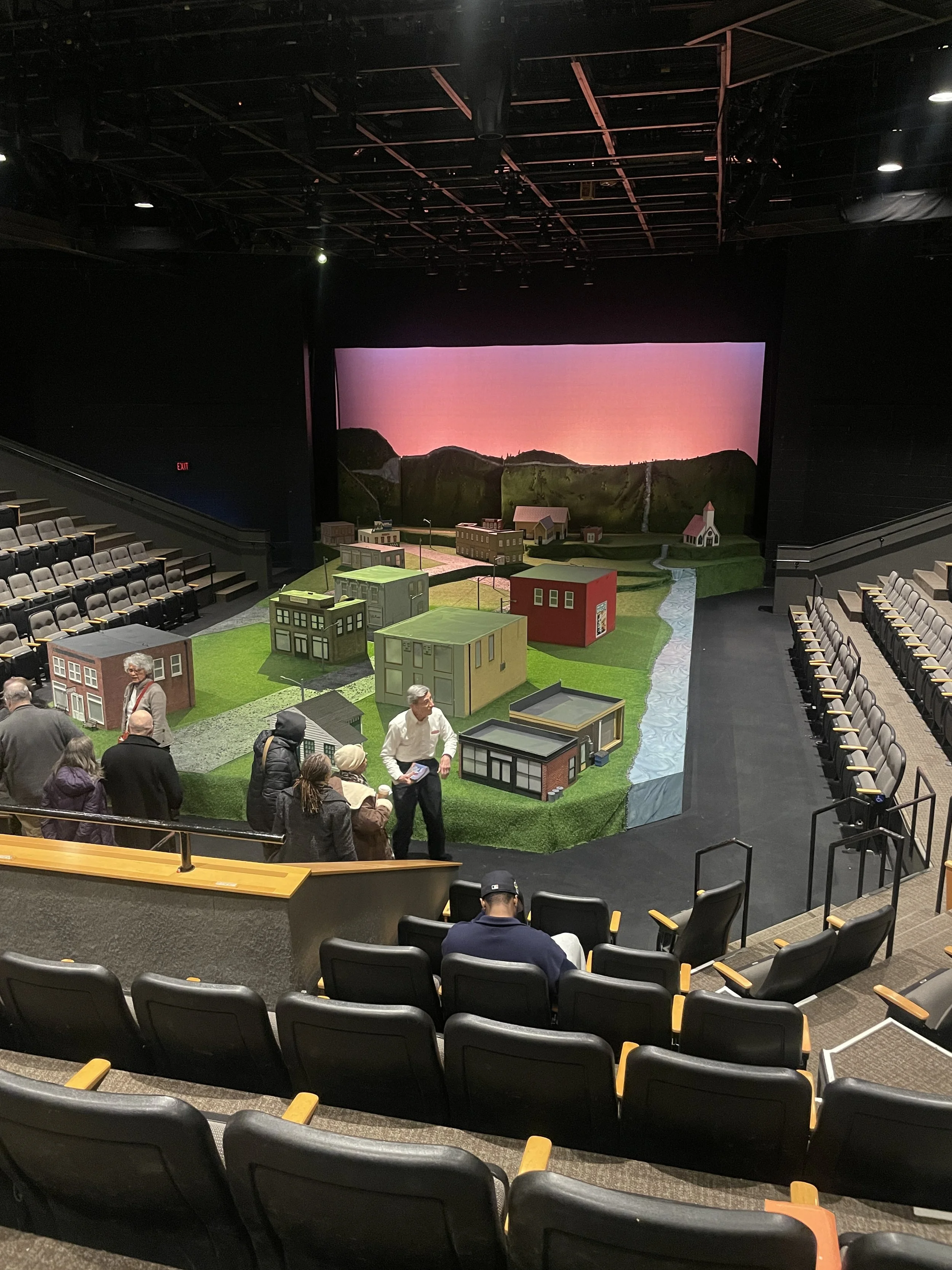 Primary Trust takes place in the small fictional town of Cranberry, New York. “small” is taken quite literally by scenic designer Lex Liang, whose whimsical mini buildings make a large impact. the small buildings light up, act as storage for costumes and props; and pull apart to indicate their interiors. it is hard not to think of Mr. Roger’s neighborhood (now, Daniel Tiger’s) when you enter the theatre— the mini town is only missing a train and an old man in a cardigan. I hesitate to call this set a backdrop, as it is incredibly well integrated and utilized by the actors as they tell the story. at Wally’s, Kenneth’s favorite bar, the building pulls out into a corner booth where he and Bert, played by Samuel Ray Gates, drink the night away. Wally’s is also where Kenneth meets Corinna, one of many characters played by Rasool Jahan. Jahan’s performance works in tandem with the set design, bringing Wally’s and Primary Trust to life as waiters and customers through movement and use of space. my favorite location in the town is Le Pousselet, where Jeffrey Blair Cornell takes on the role of Bartender, draping a tablecloth over the building structure and executing a very fancy ball change as he enters and exits the stage.